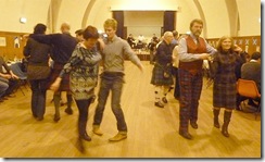 The Saturday Burns Supper was hosted by the Lothian Gaelic choir of which I am a member. It was altogether rowdier and the speeches long and funny. We sang a couple of songs, which were followed by dancing to a band playing on the stage. You can see by the out of focus dancers just how fast they were moving. Scottish ceilidh dancing is not sedate! I can’t dance any more so sat on the sidelines watching for a while but then with a drive home to Peebles in front of me and a possible threat of snow – which thankfully came to nothing – I decided to head off home. I left the hall to its fun and laughter, and headed off into the night!